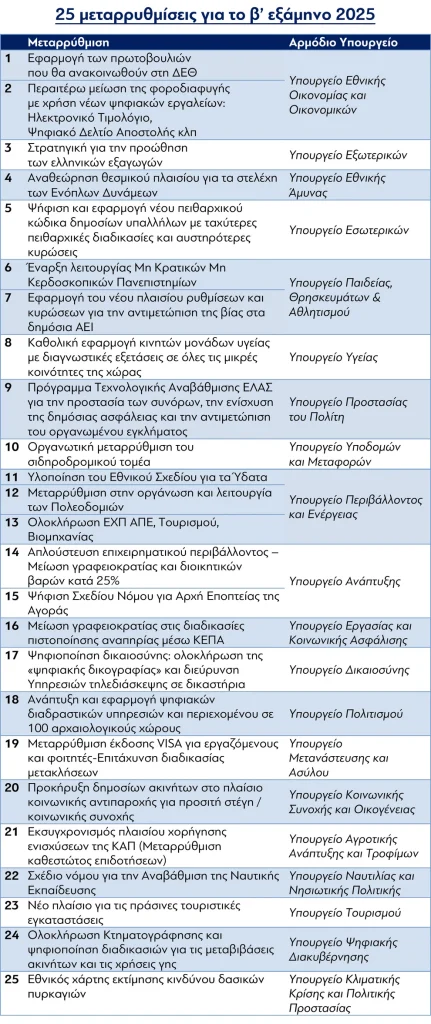 Ειδικότερα, οι 25 μεταρρυθμίσεις περιλαμβάνουν αναλυτικά τα εξής: