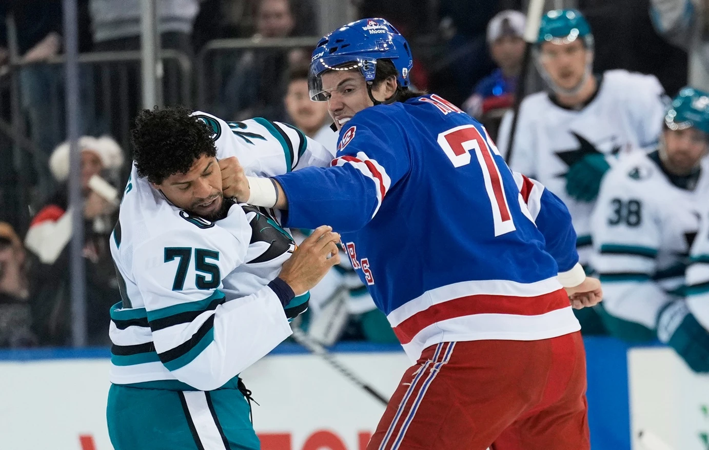 Η δυνατή μονομαχία έλαβε χώρα στο κέντρο του πάγου κατά την πρώτη περίοδο της αναμέτρησης, η οποία έληξε με ήττα των Ρέιντζερς με 6-5 στην παράταση από τους Σαρκς.