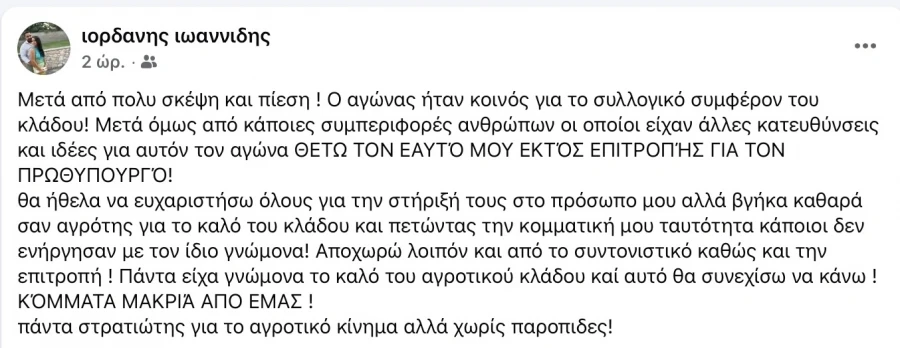 θα ήθελα να ευχαριστήσω όλους για την στήριξή τους στο πρόσωπο μου αλλά βγήκα καθαρά σαν αγρότης για το καλό του κλάδου και πετώντας την κομματική μου ταυτότητα κάποιοι δεν ενήργησαν με τον ίδιο γνώμονα! Αποχωρώ λοιπόν και από το συντονιστικό καθώς και την επιτροπή! Πάντα είχα γνώμονα το καλό του αγροτικού κλάδου και αυτό θα συνεχίσω να κάνω! ΚΌΜΜΑΤΑ ΜΑΚΡΙΆ ΑΠΟ ΕΜΑΣ! Πάντα στρατιώτης για το αγροτικό κίνημα αλλά χωρίς παρωπίδες!»