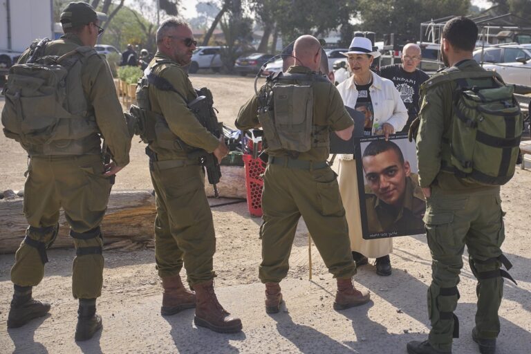 Varda Ben Baruch, holding a picture of her grandson Edan Alexander, who is held hostage in Gaza, talks with Israeli soldiers to call out on loudspeakers in hopes that their loved ones will hear them, near the Gaza border in Kibbutz Nir Oz, southern Israel, Sunday, April 20, 2025. (AP Photo/Ohad Zwigenberg )