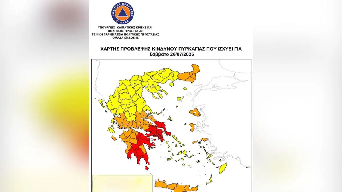 Η χώρα ετοιμάζεται να αντιμετωπίσει το πιο επικίνδυνο Σαββατοκύριακο του φετινού καλοκαιριού, με τον κίνδυνο πυρκαγιών να αγγίζει την ανώτατη κατηγορία 5 σύμφωνα με το Υπουργείο Κλιματικής Κρίσης και Πολιτικής Προστασίας. Ο χάρτης πρόβλεψης κινδύνου θυμίζει «πολεμικό ανακοινωθέν» με τις κόκκινες ζώνες να καλύπτουν Αττική, Βοιωτία, Εύβοια και όλη την Πελοπόννησο.