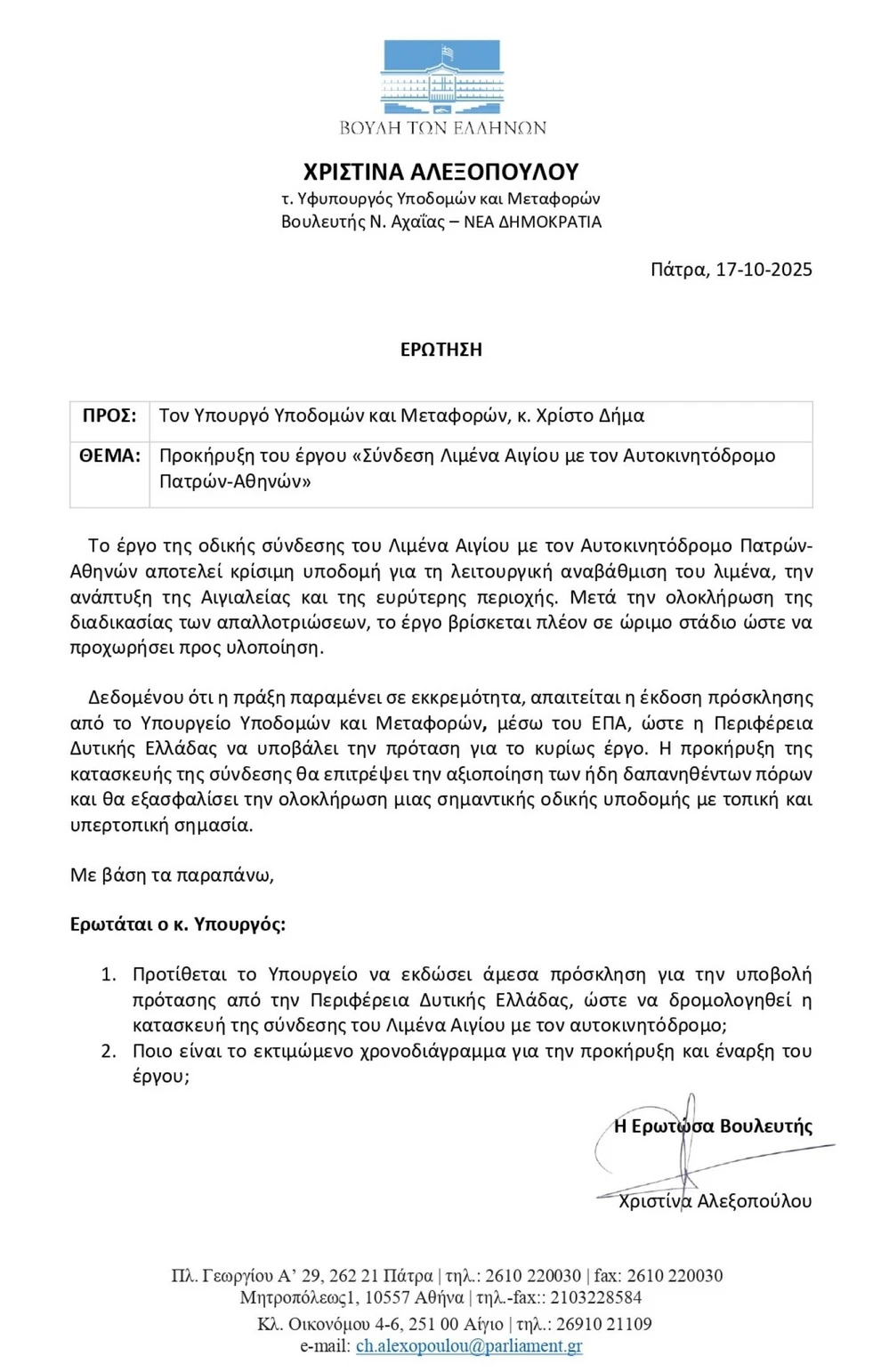 Την ενεργοποίηση του έργου σύνδεσης του Λιμένα Αιγίου με τον Αυτοκινητόδρομο Πατρών-Αθηνών, το οποίο παραμένει σε εκκρεμότητα παρά την ολοκλήρωση της διαδικασίας απαλλοτριώσεων, αναδεικνύει με κοινοβουλευτική της ερώτηση προς τον Υπουργό Υποδομών και Μεταφορών, Χρίστο Δήμα, η τ. υφυπουργός Υποδομών και Μεταφορών και Βουλευτής ΝΔ Αχαΐας, Χριστίνα Αλεξοπούλου.