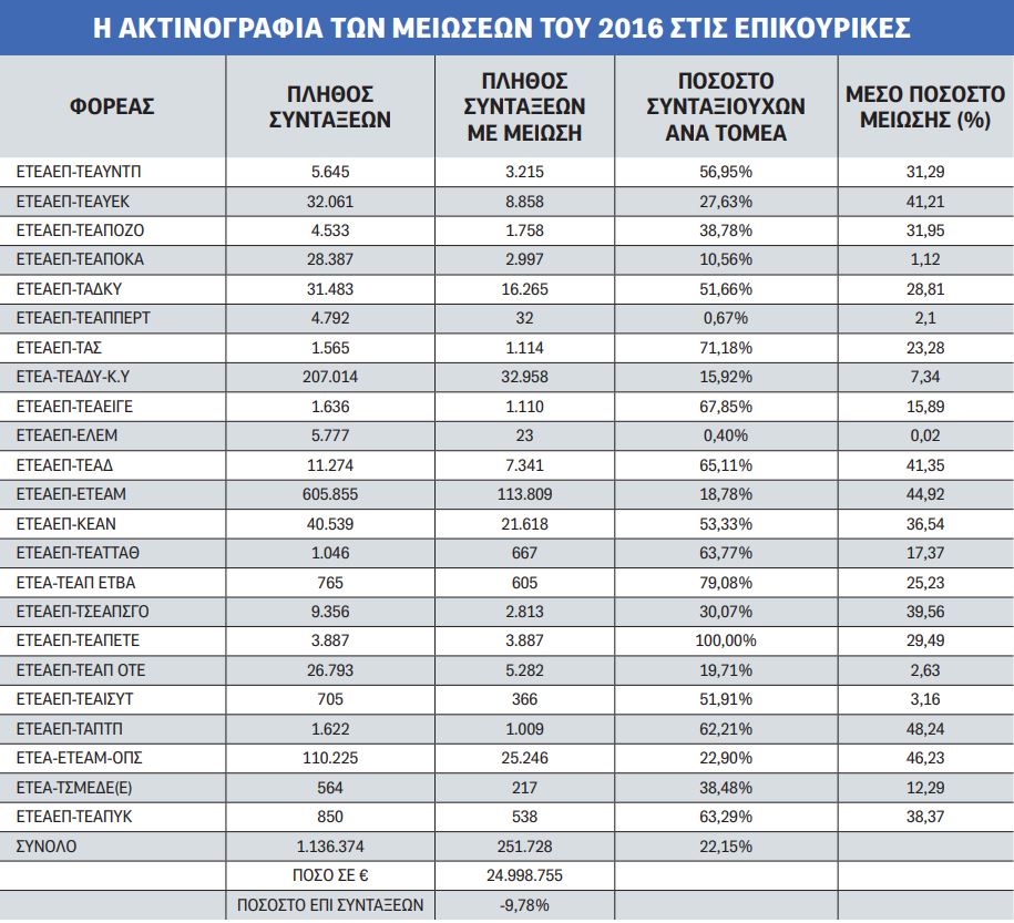 Στον αέρα τινάζονται οι επικουρικές, νέες και παλαιές, καθώς κρίνεται αντισυνταγµατικός ο νέος τρόπος υπολογισµού από το 2016 και µετά, όπως και ο επανυπολογισµός και οι περικοπές των παλαιών επικουρικών συντάξεων το 2016. Η απόφαση επηρεάζει σηµαντικά κατ’ αρχάς τους 260.000 συνταξιούχους που έχασαν έως και πάνω από 200 ευρώ το 2016 επειδή είχαν άθροισµα κύριας και επικουρικής πάνω από 1.300 ευρώ. Τότε µειώθηκαν συντάξεις κυρίως πρώην µισθωτών του τ. ΙΚΑ, όπως επίσης τραπεζοϋπαλλήλων, εµποροϋπαλλήλων κ.ά. Η πλειονότητα έχασε ποσά 100-200 ευρώ.