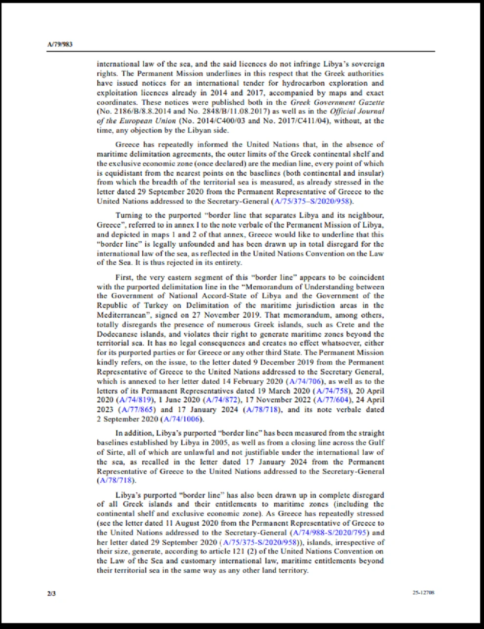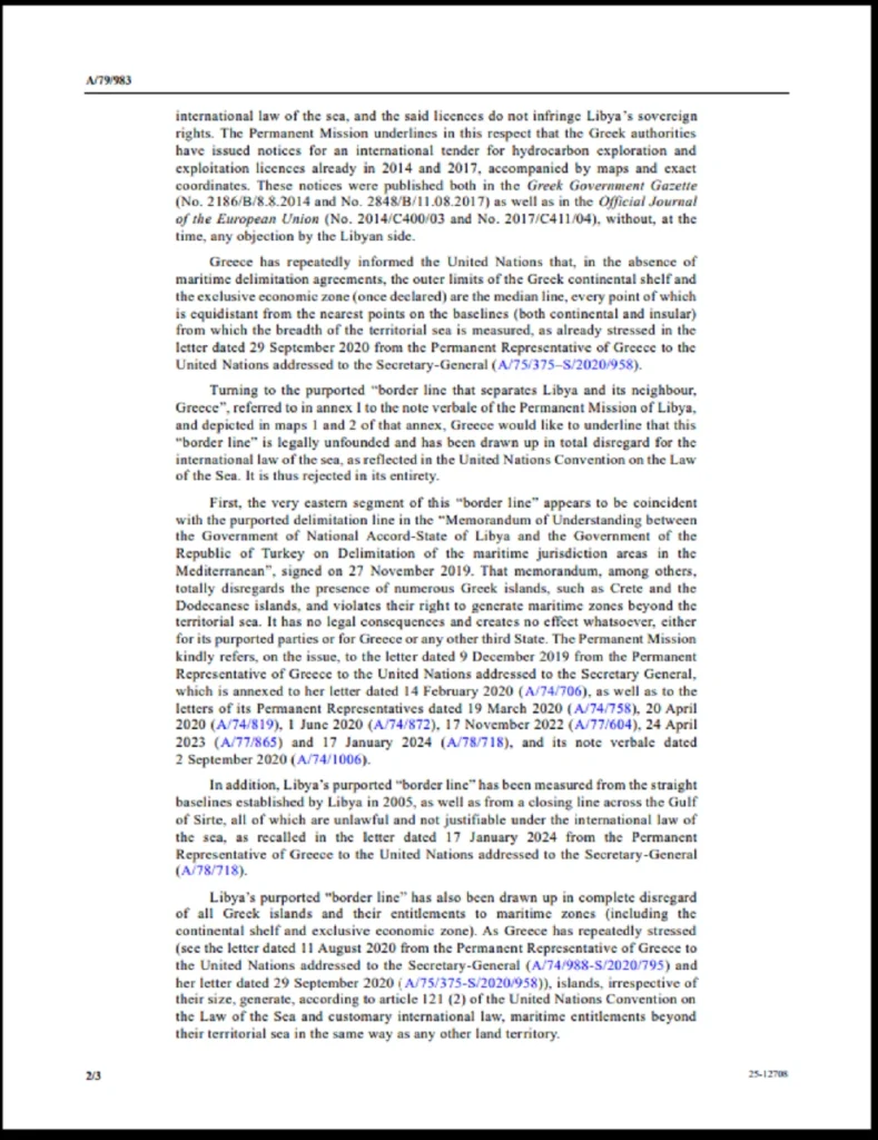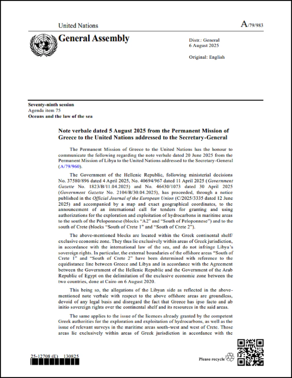 Αναρτήθηκε η ρηματική διακοίνωση που εστάλη από την Ελλάδα στον ΟΗΕ, με την οποία καταρρίπτονται οι ισχυρισμοί της Λιβύης σε ό,τι αφορά τα θαλάσσια οικόπεδα νότια της Κρήτης