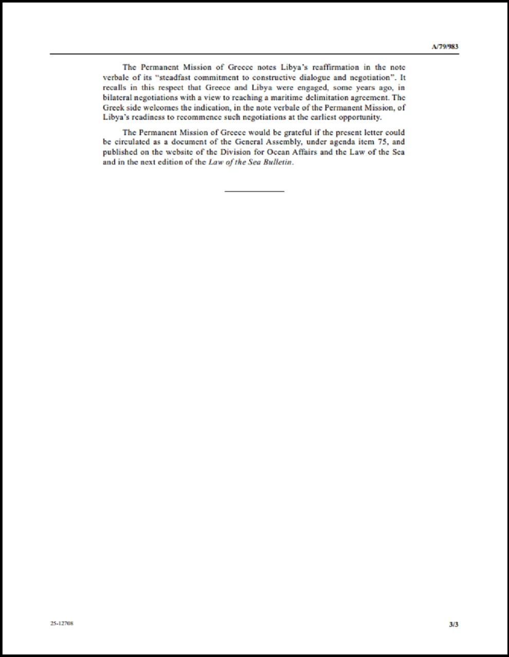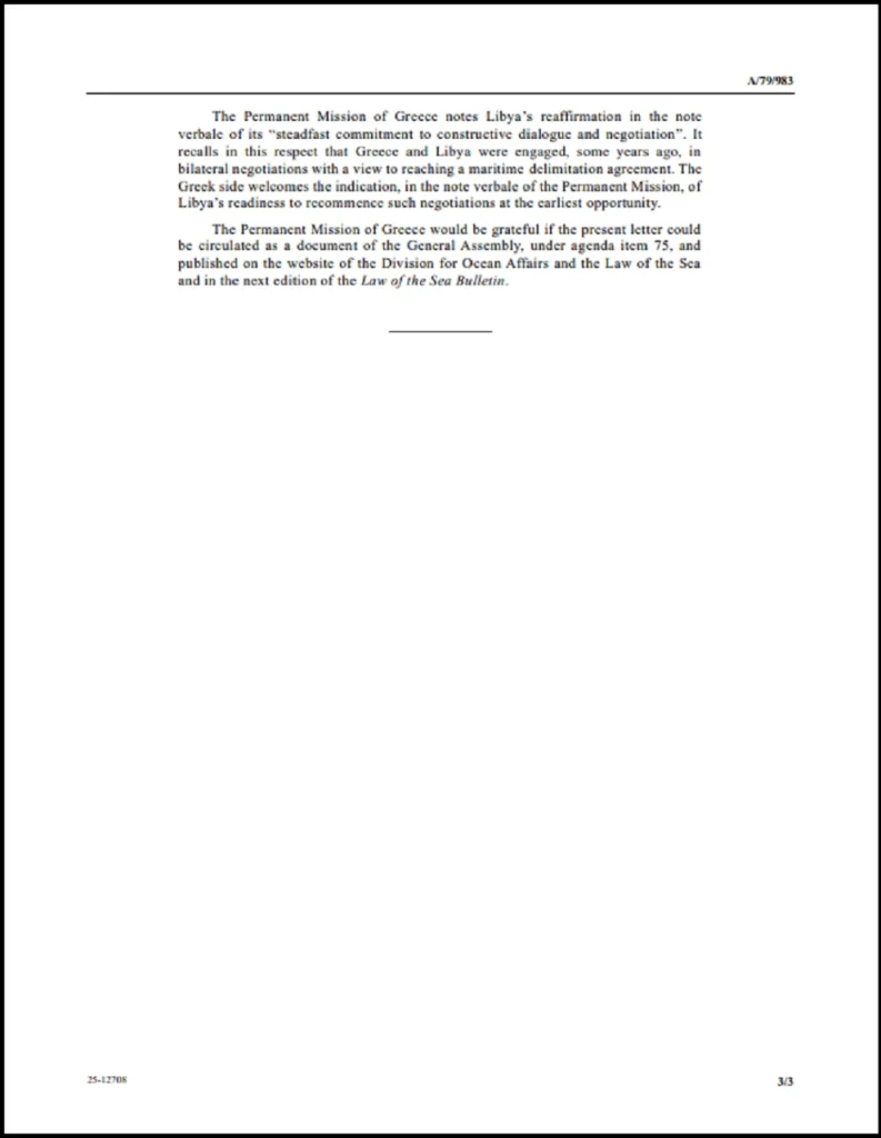 Επομένως, οι ισχυρισμοί της λιβυκής πλευράς, όπως αντικατοπτρίζονται στην προαναφερθείσα ρηματική διακοίνωση σχετικά με τις παραπάνω υπεράκτιες περιοχές, είναι αβάσιμοι, στερούνται οποιασδήποτε νομικής βάσης και αγνοούν το γεγονός ότι η Ελλάδα έχει ipso facto και ab initio κυριαρχικά δικαιώματα επί της υφαλοκρηπίδας και των πόρων της στις εν λόγω περιοχές».