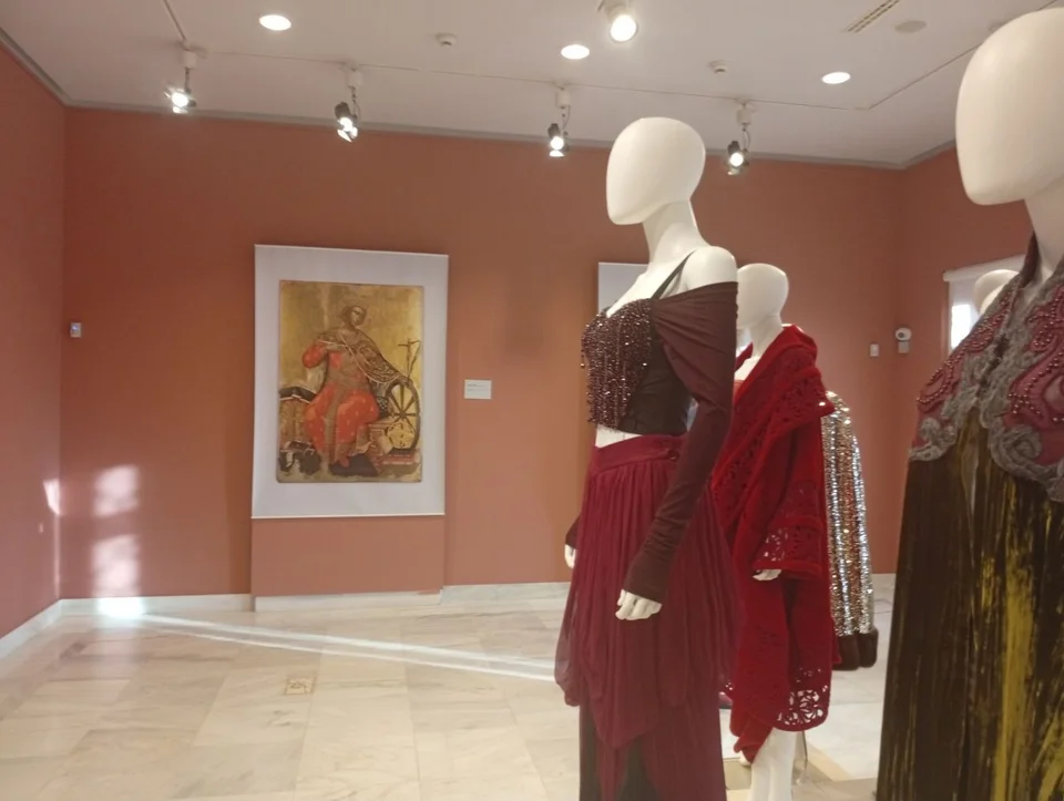Με μια στοχευμένη επιλογή 20 φορεμάτων που συνοδεύονται με μοναδικά αξεσουάρ, η έκθεση ρίχνει φως στην επιρροή που άσκησε η βυζαντινή τέχνη και αισθητική πάνω στις συλλογές που δημιούργησαν από την δεκαετία του ’60 έως και το 2020, οι σημαντικότεροι Ιταλοί σχεδιαστές μόδας, όπως οι Armani, Ferré, Prada, Valentino, Versace, Capucci, Dolce e Gabbana, Krizia, Gucci και Romeo Gigli.
