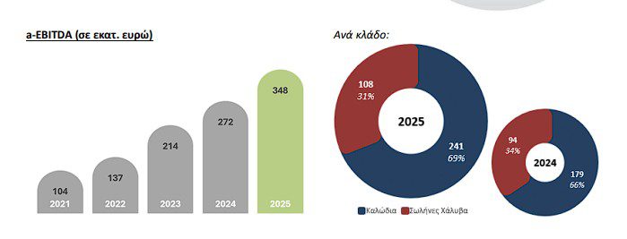 Στον τομέα σωλήνων χάλυβα, οι επιδόσεις ενισχύθηκαν περαιτέρω σε σχέση με το 2024, με αύξηση παραγωγής κατά 17% και αναπροσαρμοσμένο EBITDA 108 εκατ. ευρώ (+15%). Το ανεκτέλεστο διαμορφώθηκε στα 491 εκατ. ευρώ, ενώ ολοκληρώθηκαν κρίσιμες επενδύσεις, όπως η εγκατάσταση Concrete Weight Coating για υποθαλάσσια έργα αγωγών.