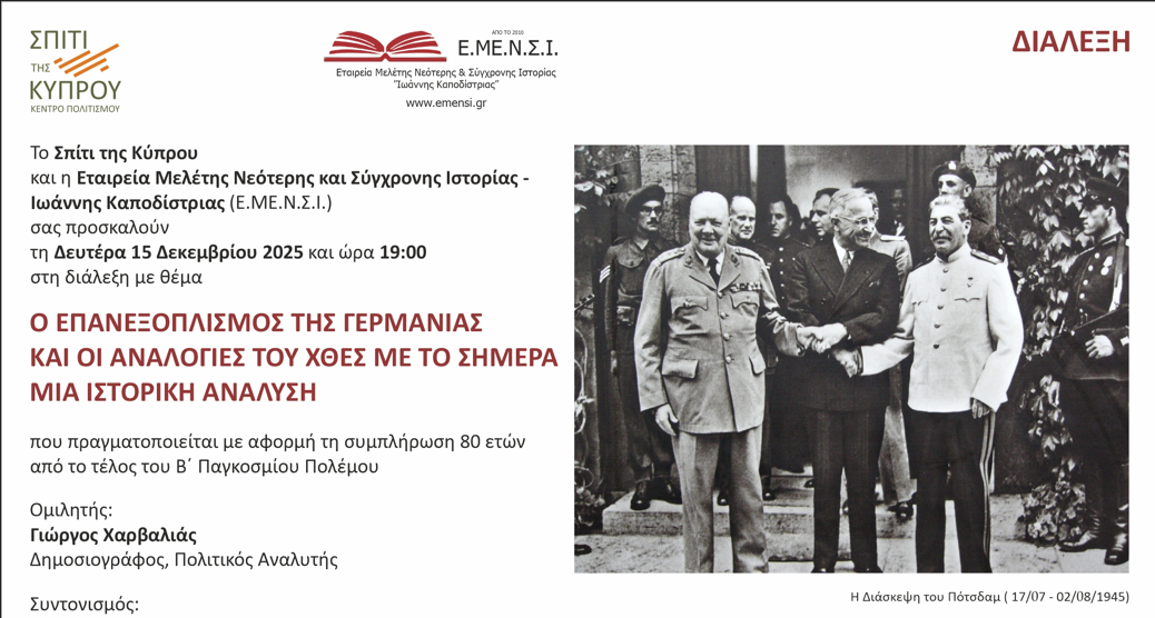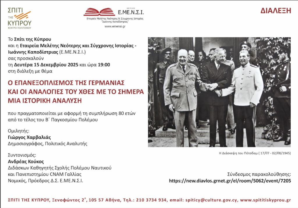 Η διάλεξη του Γιώργου Χαρβαλιά, πολιτικού αναλυτή και δημοσιογράφου, με θέμα «Ο επανεξοπλισμός της Γερμανίας και οι αναλογίες του χθες με το σήμερα» θα εξετάσει τη γεωπολιτική εξέλιξη της Γερμανίας και την εξέλιξή της μετά το τέλος του Β’ Παγκοσμίου Πολέμου. Η εκδήλωση θα πραγματοποιηθεί τη Δευτέρα, 15 Δεκεμβρίου 2025, στις 19:00 στο Σπίτι της Κύπρου, στην Αθήνα, και θα συντονιστεί από τον Διδάσκοντα Καθηγητή Ανδρέα Κούκο, Πρόεδρο του Δ.Σ. της Ε.ΜΕ.Ν.Σ.Ι.