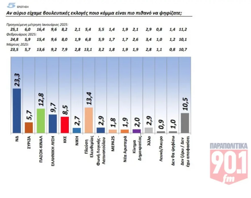 Νέα δημοσκόπηση από τη GPO για τα Παραπολιτικά 90,1 βλέπει το φως της δημοσιότητας, με τη Νέα Δημοκρατία να καταγράφει ποσοστό 23,3% στην πρόθεση ψήφου (25,1% Ιανουάριος 2025, 24,8% Φεβρουάριος 2025, 23,5% Μάρτιος 2025) και την Πλεύση Ελευθερίας της Ζωής Κωνσταντοπούλου να συνεχίζει την ανοδική πορεία.
