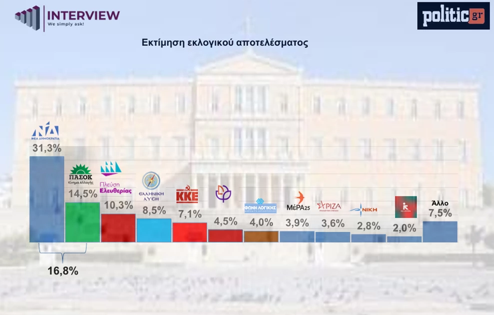 Σταθερό παραμένει το προβάδισμα της Νέας Δημοκρατίας στην πρόθεση ψήφου, σύμφωνα με τα ευρήματα της νέας δημοσκόπησης της Interview για λογαριασμό της εφημερίδας Politic.