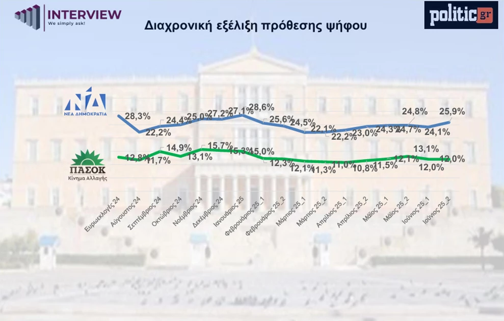 Η Νέα Δημοκρατία παρουσιάζει μικρή άνοδο σε σχέση με τον προηγούμενο μήνα, ανεβαίνοντας από το 24,8% του Μαΐου στο 25,9% τον Ιούνιο. Το ποσοστό της παραμένει ωστόσο χαμηλότερο από εκείνο που θα εξασφάλιζε αυτοδυναμία. Στη δεύτερη θέση βρίσκεται το ΠΑΣΟΚ, το οποίο καταγράφει μικρή πτώση, από το 13,1% στο 12%. Η Πλεύση Ελευθερίας ακολουθεί με 8,5%, σημειώνοντας πτώση μισής μονάδας από το 9%, ενώ η Ελληνική Λύση περιορίζεται στο 7% από 7,8% τον προηγούμενο μήνα.