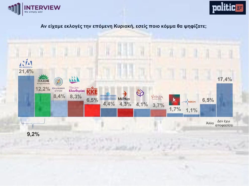Πίσω τους στη δημοσκόπηση της εταιρείας Interview για λογαριασμό του politic.gr, ακολουθούν ΚΚΕ (7,8%), Κίνημα Δημοκρατίας (5,3%), Φωνή Λογικής (5,2%) και ΜέΡΑ25 (5%). Ο ΣΥΡΙΖΑ περιορίζεται στην ένατη θέση με 4,5%, ενώ ακολουθούν η Νίκη (2,1%) και η Νέα Αριστερά (1,4%). Στο «άλλο κόμμα» το ποσοστό φτάνει το 7,9%.
