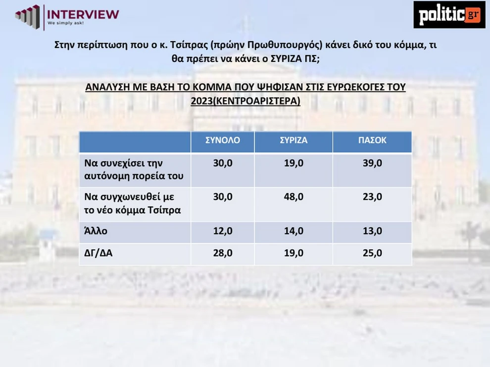 Στο ερώτημα για το τι θα πρέπει να πράξει ο ΣΥΡΙΖΑ σε περίπτωση που ο Αλέξης Τσίπρας προχωρήσει στην ίδρυση νέου κόμματος: Το 30% θεωρεί ότι ο ΣΥΡΙΖΑ πρέπει να συνεχίσει την αυτόνομη πορεία του, ενώ άλλο ένα 30% προκρίνει τη συγχώνευση με τον νέο πολιτικό φορέα. Σημαντικό παραμένει το ποσοστό όσων δεν τοποθετούνται (28%), αποτυπώνοντας την αβεβαιότητα στο εσωτερικό της Κεντροαριστεράς.