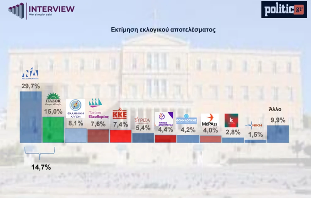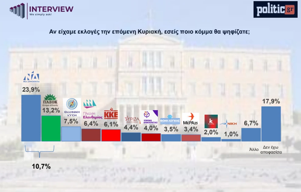 Ανάκαμψη για τη Νέα Δημοκρατία, μικρή ενίσχυση για το ΠΑΣΟΚ και σχετική στασιμότητα για τα υπόλοιπα κόμματα, καταγράφει η νέα δημοσκόπηση της Interview για την εφημερίδα Politic.gr.