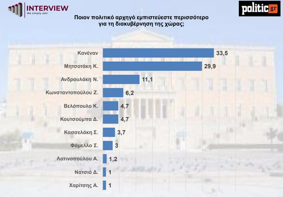 Στην ερώτηση για τον πολιτικό αρχηγό που εμπιστεύονται περισσότερο οι πολίτες για τη διακυβέρνηση της χώρας, προηγείται η απάντηση «κανένας» με 33,5%. Ο Κυριάκος Μητσοτάκης ακολουθεί με 29,9%, ενώ τρίτος έρχεται ο Νίκος Ανδρουλάκης με 11,1%. Η Ζωή Κωνσταντοπούλου συγκεντρώνει 6,2%, ο Κυριάκος Βελόπουλος και ο Δημήτρης Κουτσούμπας από 4,7%, ο Στέφανος Κασσελάκης 3,7% και ο Σωκράτης Φάμελλος 3%.