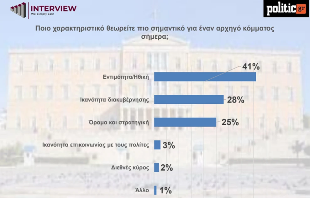 Η «εντιμότητα και ηθική» αναδεικνύονται ως το σημαντικότερο χαρακτηριστικό που πρέπει να διαθέτει ένας αρχηγός κόμματος, σύμφωνα με το 41% των ερωτηθέντων.