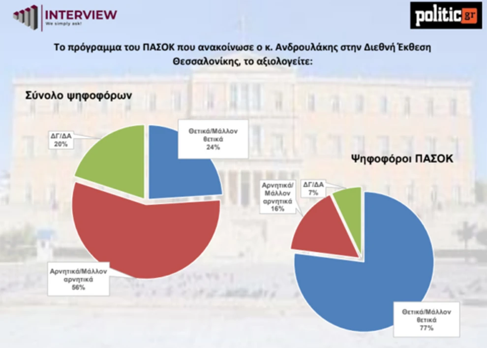 Το 56% των πολιτών κρίνει αρνητικά το πρόγραμμα του ΠΑΣΟΚ που παρουσίασε ο Νίκος Ανδρουλάκης στη ΔΕΘ, ενώ το 24% το αξιολογεί θετικά και ένα 20% δεν εκφράζει άποψη.