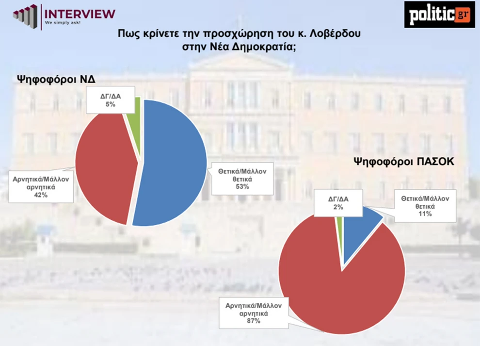 Σχετικά με την προσχώρηση του Ανδρέα Λοβέρδου στη Νέα Δημοκρατία, το 53% των ψηφοφόρων του κυβερνώντος κόμματος την κρίνει θετικά, το 42% αρνητικά και το 5% δεν εκφράζει άποψη. Αντίθετα, στους ψηφοφόρους του ΠΑΣΟΚ η αντίδραση είναι έντονα αρνητική, με το 87% να την απορρίπτει, το 11% να την εγκρίνει και το 2% να δηλώνει ουδέτερο.