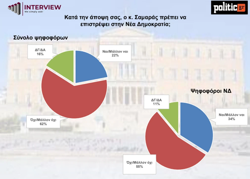 Αρνητική είναι και η στάση της πλειοψηφίας των πολιτών απέναντι στο ενδεχόμενο επιστροφής του Αντώνη Σαμαρά στη ΝΔ. Συγκεκριμένα, το 62% απαντά «όχι» ή «μάλλον όχι», το 22% «ναι» ή «μάλλον ναι» και το 16% δεν εκφράζει γνώμη. Μεταξύ των ψηφοφόρων της ΝΔ, το 34% βλέπει θετικά ένα τέτοιο σενάριο, ενώ το 55% εκφράζεται αρνητικά και το 11% δηλώνει ουδέτερο.