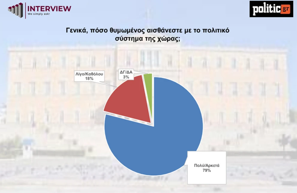 Το 79% των ερωτηθέντων δηλώνει ότι αισθάνεται «πολύ» ή «αρκετά» θυμωμένο με το πολιτικό σύστημα, ενώ μόλις το 18% απαντά «λίγο» ή «καθόλου».