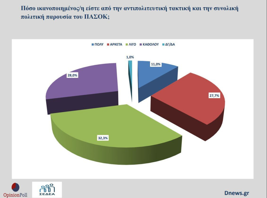 1. Η πλειοψηφία των ψηφοφόρων του ΠΑΣΟΚ σε ποσοστό 60.3% δηλώνει λίγο ή και καθόλου ικανοποιημένο από την αντιπολιτευτική πολιτική του και την συνολική πολιτική παρουσία του ( 32.3% λίγο, 28% καθόλου) . Το 38.7% δηλώνει πολύ και αρκετά ικανοποιημένο.