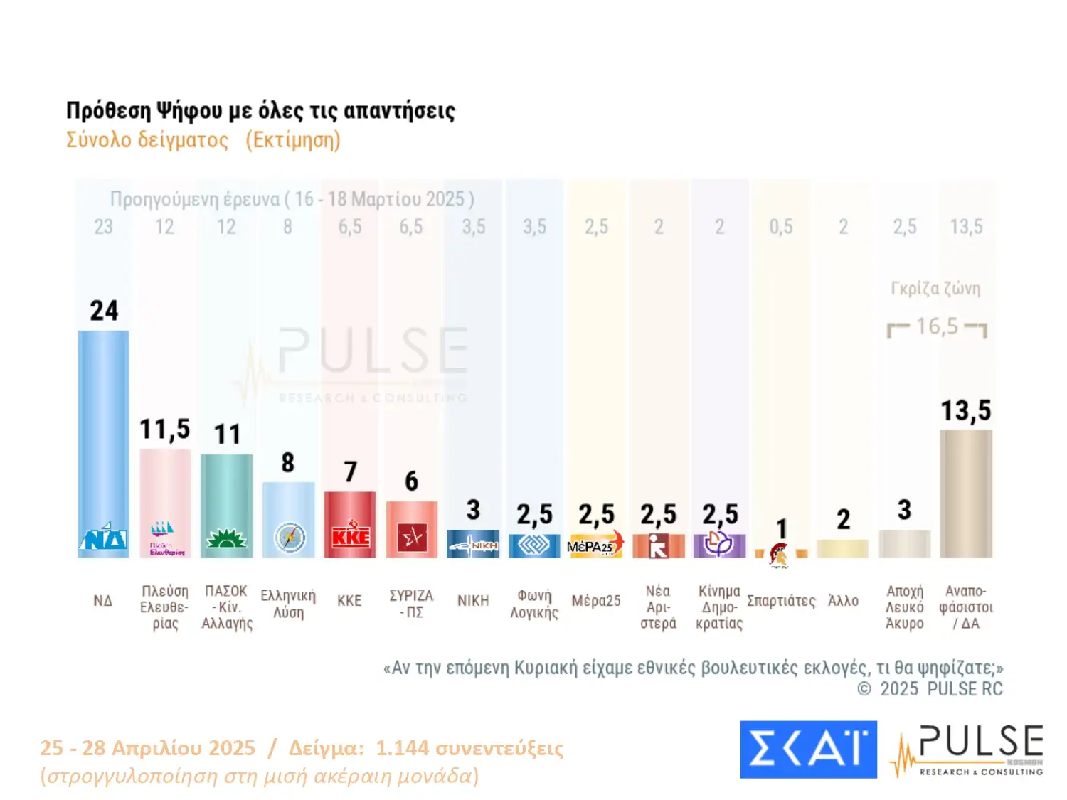 Όσον αφορά τα ποσοστά των κομμάτων η Νέα Δημοκρατίας παραμένει πρώτη με 29% ενώ στη δεύτερη θέση παραμένει η Πλεύση Ελευθερίας με 14% και τρίτο το ΠΑΣΟΚ με 13%. Ο ΣΥΡΙΖΑ συνεχίζει να καταγράφει χαμηλές πτήσεις με 7%.