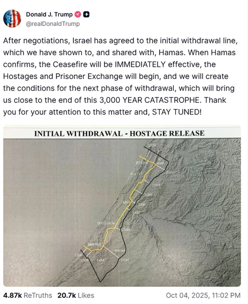 Ο Αμερικανός πρόεδρος παρουσίασε επίσης ένα νέο στοιχείο του ειρηνευτικού του σχεδίου, δημοσιεύοντας χάρτη με την «αρχική γραμμή αποχώρησης» των ισραηλινών δυνάμεων στη Γάζα.