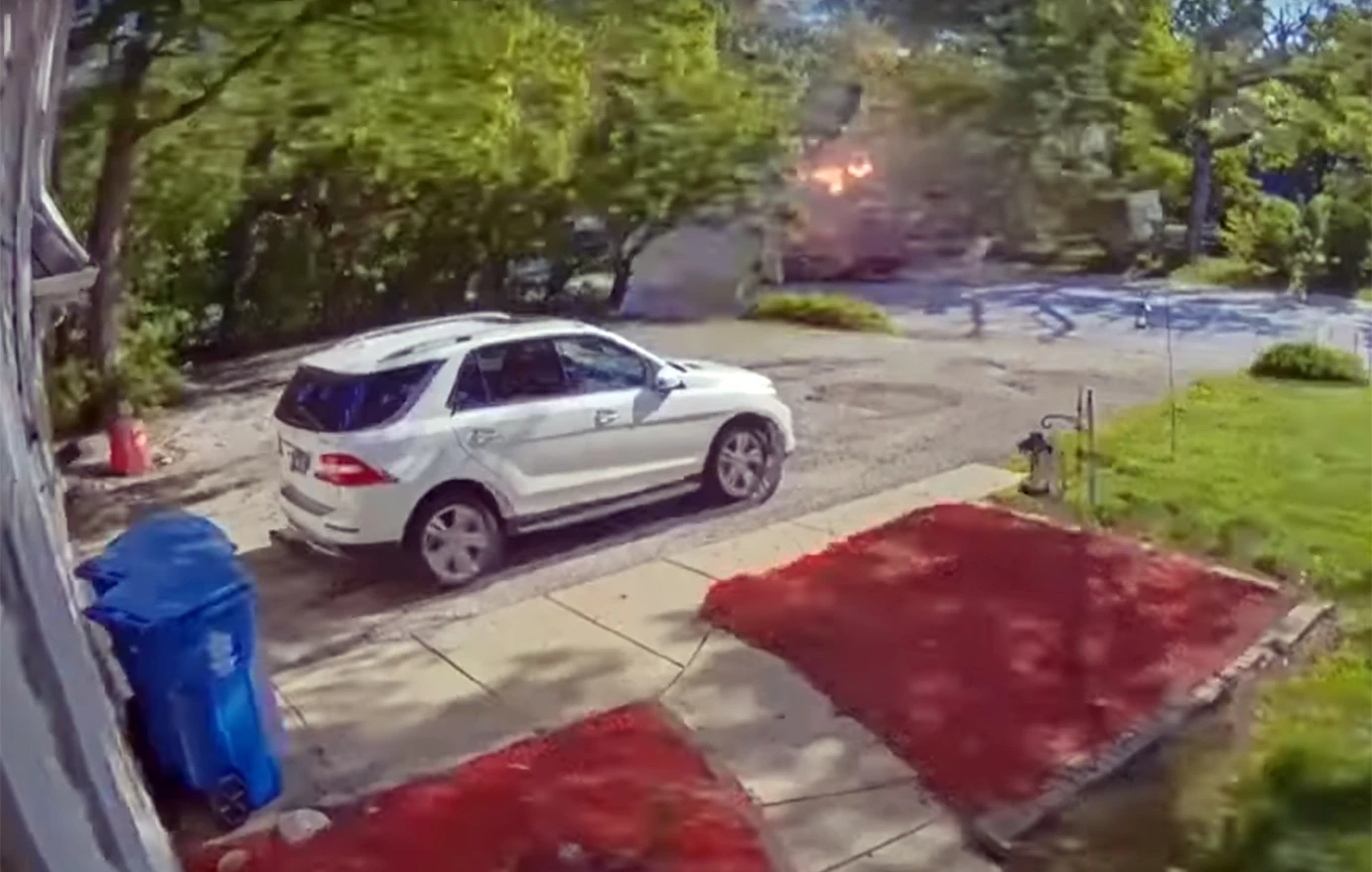 Το βίντεο που καταγράφηκε από κάμερα ασφαλείας σπιτιού δείχνει το φορτηγό να κινείται σε κατοικημένο δρόμο πριν σημειωθεί αιφνίδια και ισχυρή έκρηξη.