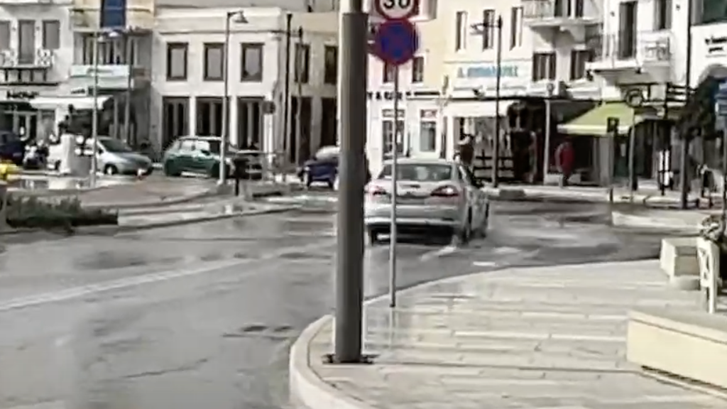 Η Ερμούπολη πλήττεται από έντονη κακοκαιρία. Οι δρόμοι έχουν μετατραπεί σε ποτάμια, καθώς τα νερά της θάλασσας έχουν βγει στους δρόμους, σκεπάζοντας πεζοδρόμια και προκαλώντας προβλήματα σε καταστήματα και αυτοκίνητα.