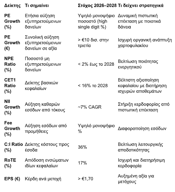Για την περίοδο 2026–2028, η Τράπεζα θέτει φιλόδοξους αλλά ρεαλιστικούς στόχους, προβλέποντας χαμηλή έως υψηλή μονοψήφια ετήσια αύξηση στα καθαρά έσοδα από τόκους (CAGR τριετίας ~7%), περαιτέρω βελτίωση του καθαρού επιτοκιακού περιθωρίου σε επίπεδα άνω των 290 μ.β. έως το 2028 και συγκράτηση του δείκτη κόστους προς έσοδα κοντά στο 36%. Τα κέρδη ανά μετοχή εκτιμάται ότι θα υπερβούν τα €1,7 το 2028, με την απόδοση ενσώματων ιδίων κεφαλαίων να ενισχύεται στο 17%, ενώ ο δείκτης ΜΕΑ αναμένεται να διαμορφωθεί κάτω από 2%.