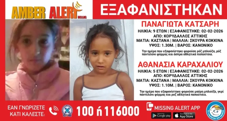 Σύμφωνα με το «Χαμόγελο του Παιδιού» στις 02/02/2026, και ώρα 15.00, εξαφανίστηκαν οι ανήλικες Παναγιώτα Κάτσαρη και Αθανασία Καραχάλιου, από τον Κορυδαλλό Αττικής και έκτοτε αγνοούνται.