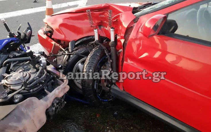 Η σύγκρουση ήταν σφοδρή και η μηχανή καρφώθηκε κυριολεκτικά στο φτερό του αυτοκινήτου, ενώ ο οδηγός «πέταξε» και προσγειώθηκε πολλά μέτρα μακριά μέσα στο οδόστρωμα.