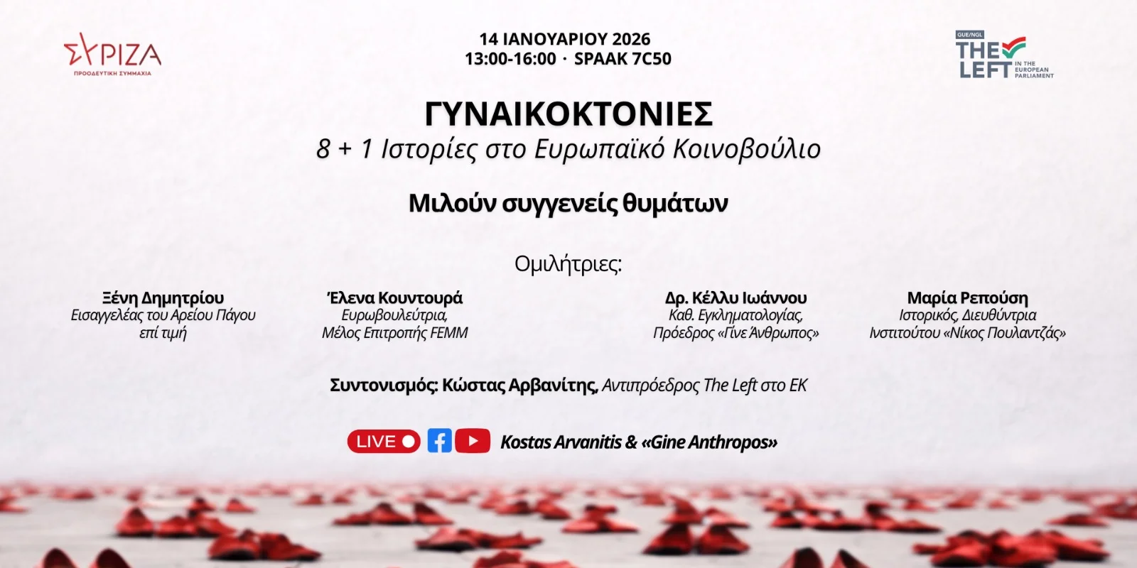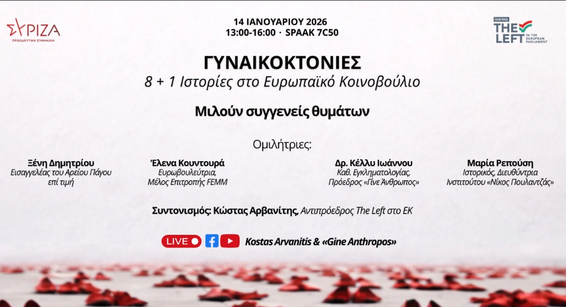 Μια ιδιαίτερα εκδήλωση θα πραγματοποιηθεί την Τετάρτη 14 Ιανουαρίου 2026 στις Βρυξέλλες, με θέμα τις γυναικοκτονίες, το πιο ακραίο και οδυνηρό αποτέλεσμα της έμφυλης βίας που εξακολουθεί να στοιχίζει ζωές σε ολόκληρη την Ευρώπη. Με τίτλο «Γυναικοκτονίες: 8 + 1 ιστορίες στο Ευρωπαϊκό Κοινοβούλιο», η πρωτοβουλία του Κώστα Αρβανίτη, Αντιπροέδρου της πολιτικής ομάδας της Αριστεράς (The Left), στοχεύει να υπενθυμίσει ότι τα περιστατικά αυτά δεν αποτελούν «μεμονωμένα περιστατικά», αλλά ένα βαθύ κοινωνικό φαινόμενο που αντανακλά θεσμικές ελλείψεις και δομικές ανισότητες.