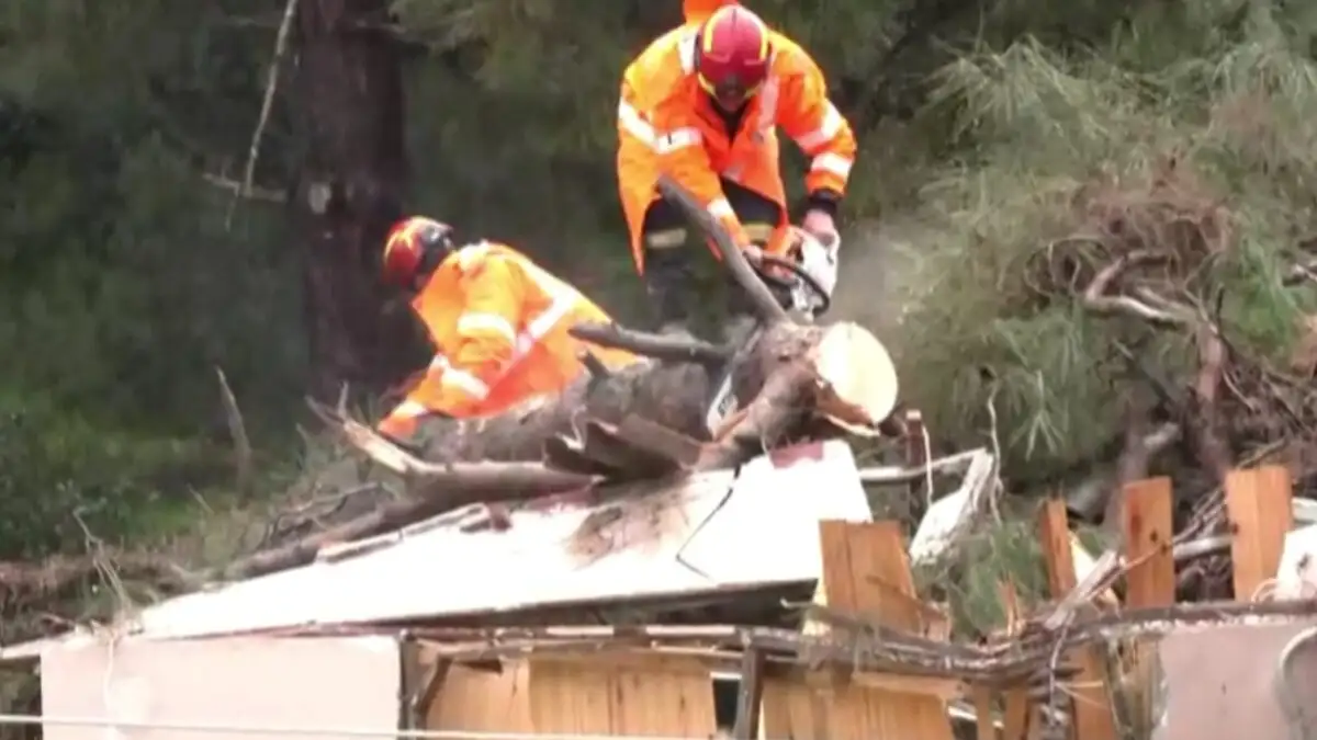 Πυροσβέστες και συνεργεία του δήμου προσπαθούν να απομακρύνουν τον κορμό.