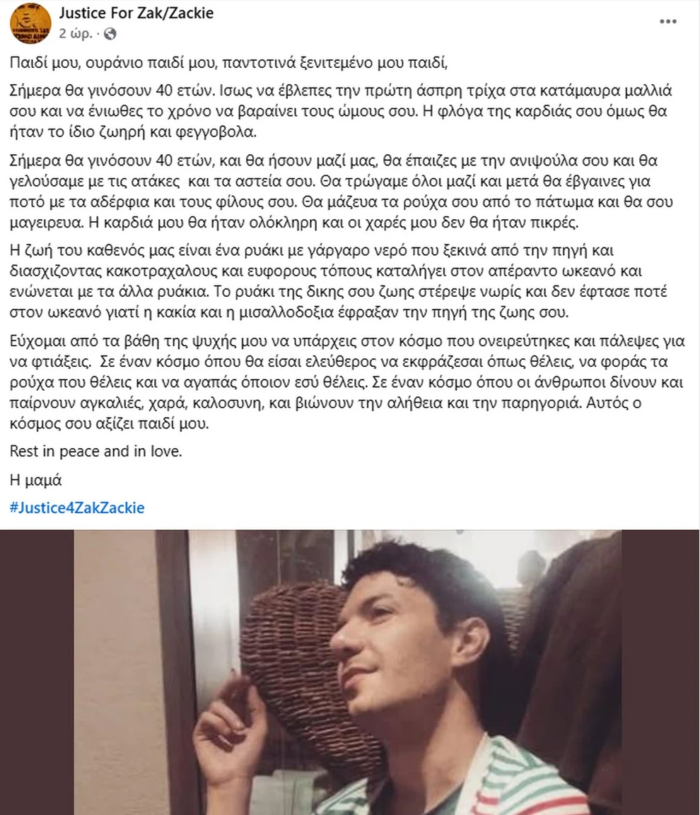 «Παιδί μου, ουράνιο παιδί μου, παντοτινά ξενιτεμένο μου παιδί, σήμερα θα γινόσουν 40 ετών», γράφει σε μια συγκινητική ανάρτηση η μητέρα του Ζακ Κωστόπουλου, ο οποίος βρήκε φριχτό θάνατο τον Σεπτέμβριο του 2018 στην Ομόνοια.
