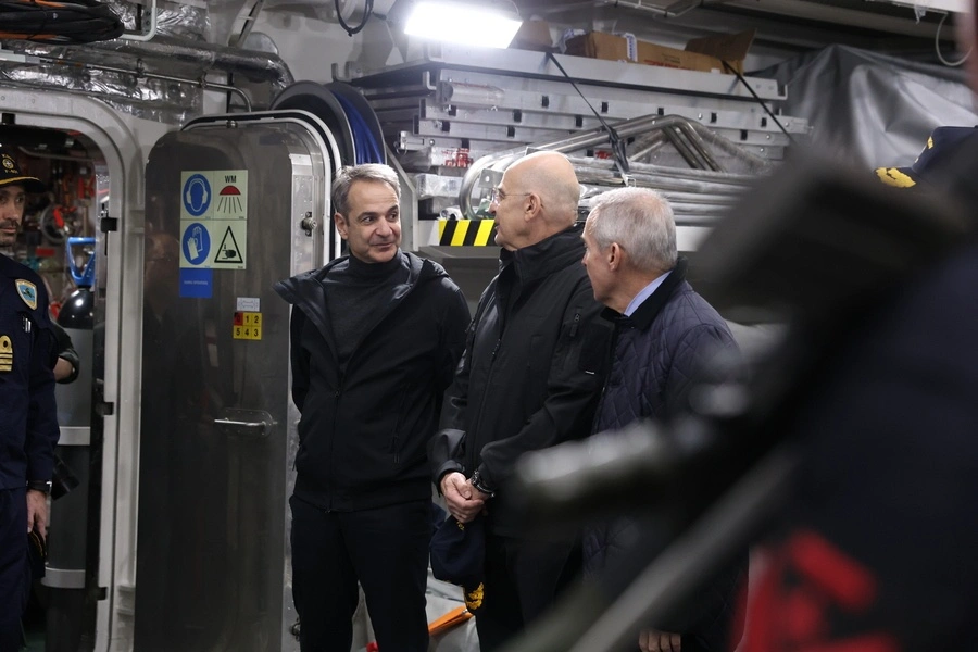 Ο πρωθυπουργός Κυριάκος Μητσοτάκης και ο υπουργός Εθνικής ‘Αμυνας Νίκος Δένδιας ξεναγούνται στην πρώτη ελληνική φρεγάτα Belharra «Κίμων», καθώς κατευθύνεται με νηοπομπή του Πολεμικού Ναυτικού στον Ναύσταθμο της Σαλαμίνας, Πέμπτη 15 Ιανουαρίου 2026.