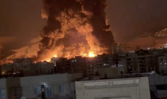 🚨 NEW VIDEO: The Tehran oil depot is completely engulfed in flames — massive fireballs and thick smoke now dominating the skyline as the facility burns out of control. pic.twitter.com/2yZwKqoANT