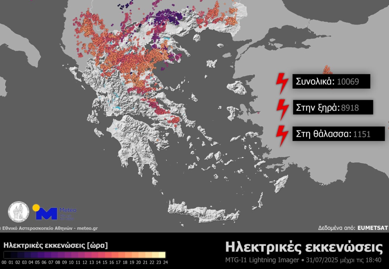 Παράλληλα, η ανάλυση δεδομένων από τον Ευρωπαϊκό μετεωρολογικό δορυφόρο τρίτης γενιάς Meteosat-12 και το Lightning Imager (LI) όργανο που φέρει, έδειξε ότι μέχρι τις 18:40 της Πέμπτης 31 Ιουλίου 2025 έχουν καταγραφεί περισσότερες από 10.000 ηλεκτρικές εκκενώσεις. Σημειώνεται ότι ως ηλεκτρικές εκκενώσεις ορίζουμε το σύνολο αυτών που συμπεριλαμβάνει τους κεραυνούς (εκκενώσεις μεταξύ νεφών και εδάφους), τις ηλεκτρικές εκκενώσεις μεταξύ νεφών καθώς και τις ηλεκτρικές εκκενώσεις μεταξύ νεφών και του περιβάλλοντος αέρα.