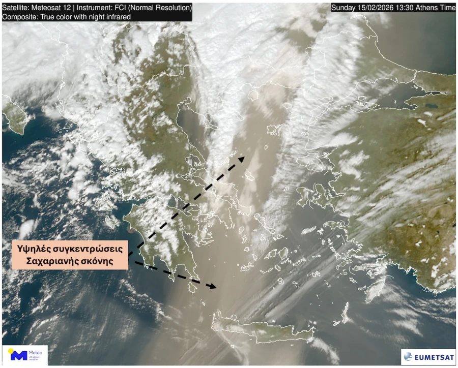Υψηλές συγκεντρώσεις Σαχαριανής σκόνης καταγράφονται σε μεγάλο μέρος της χώρας το μεσημέρι της Κυριακής 15/02 όπως διακρίνεται και από τη δορυφορική εικόνα του Ευρωπαïκού δορυφόρου MTG της EUMETSAT.