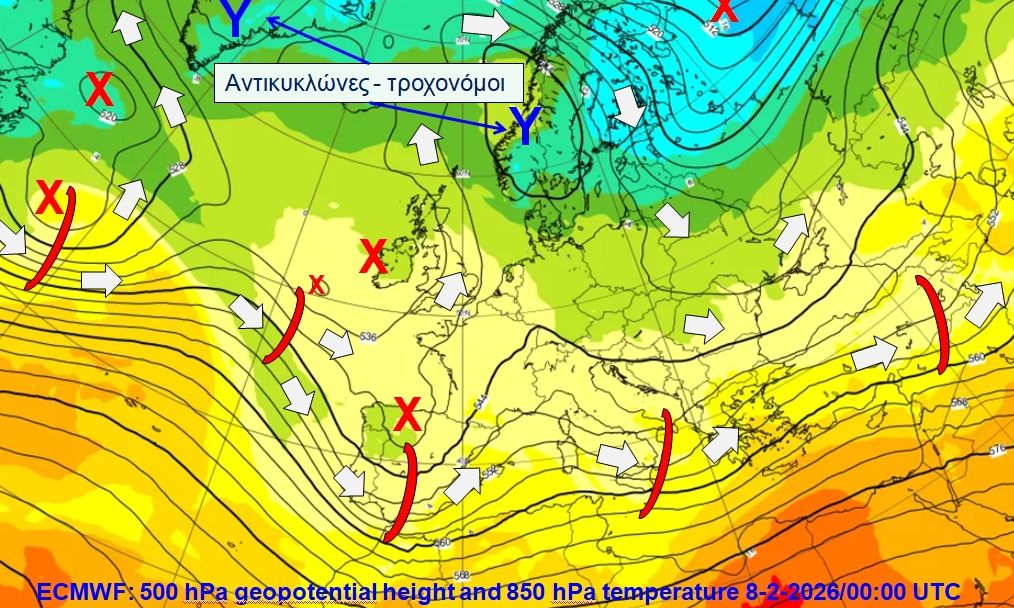 Όπως επισημαίνει, καθοριστικό ρόλο συνεχίζουν να παίζουν οι αντικυκλώνες της Γροιλανδίας και της Σκανδιναβίας, οι οποίοι λειτουργούν ως βασικοί ρυθμιστές της κυκλοφορίας των αερίων μαζών. Η παρουσία τους διατηρεί ένα μοτίβο που ευνοεί τη διέλευση ατμοσφαιρικών διαταραχών από τη δυτική προς την ανατολική Μεσόγειο.