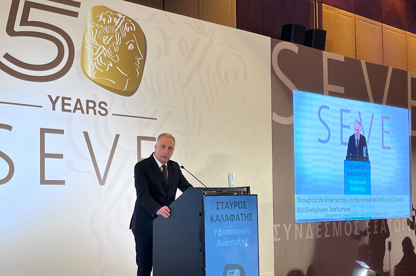 Ο κ. Καλαφάτης χαρακτήρισε τον ΣΕΒΕ “κορυφαίο εξαγωγικό φορέα της χώρας μας ο οποίος υπήρξε- και συνεχίζει να είναι- πυλώνας ανάπτυξης για τη Θεσσαλονίκη και την ευρύτερη περιοχή της Μακεδονίας”, επισημαίνοντας ότι: “Σ΄όλη την ελληνική επικράτεια 800 εταιρείες και επιχειρηματικοί όμιλοι, 80 χιλιάδες εργαζόμενοι, συνολικός κύκλος εργασιών που υπερβαίνει τα 55 δισεκατομμύρια ευρώ και εξαγωγές που φθάνουν τα 30 δισεκατομμύρια ευρώ, δηλαδή το 50% των ελληνικών εξαγώγιμων αγαθών, δεν είναι μόνο αριθμοί”. Όπως τόνισε: “Είναι η ζωντανή απόδειξη της Ελλάδας της εξωστρέφειας, της δημιουργίας, της καινοτομίας. O ΣΕΒΕ είναι πρωταγωνιστής αλλά και σύμμαχός μας στον κοινό αγώνα για σταθερή ανάπτυξη, για βιώσιμη απασχόληση, για μια ανθεκτική και δυναμική οικονομία”, υπογράμμισε ο Υφυπουργός Ανάπτυξης.