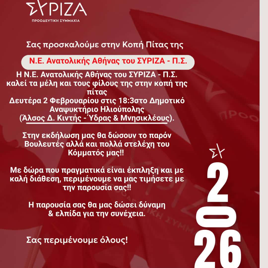 Η ΣΥΡΙΖΑ – Προοδευτική Συμμαχία συνεχίζει τις πολιτικές και οργανωτικές της δράσεις, με τη Νομαρχιακή Επιτροπή Ανατολικής Αθήνας να προγραμματίζει την καθιερωμένη κοπή της πρωτοχρονιάτικης πίτας.