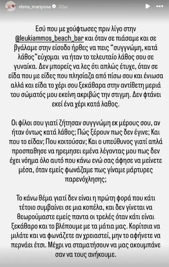 «Εσύ που με χούφτωσες πριν λίγο στην @leukiamnos_beach_bar και όταν σε πιάσαμε και σε βγάλαμε στην είσοδο ήρθες να πεις “συγγνώμη, κατά λάθος” εύχομαι να ήταν το τελευταίο λάθος σου σε γυναίκα. Δεν μπορείς να λες ότι απλώς έτυχε, όταν σε είδα που με είδες που πλησίαζα από πίσω σου και ένιωσα αλλά και είδα το χέρι σου ξεκάθαρα στην αντίθετη μεριά του σώματός μου εκείνη ακριβώς τη στιγμή. Δεν φτάνει εκεί ένα χέρι κατά λάθος.