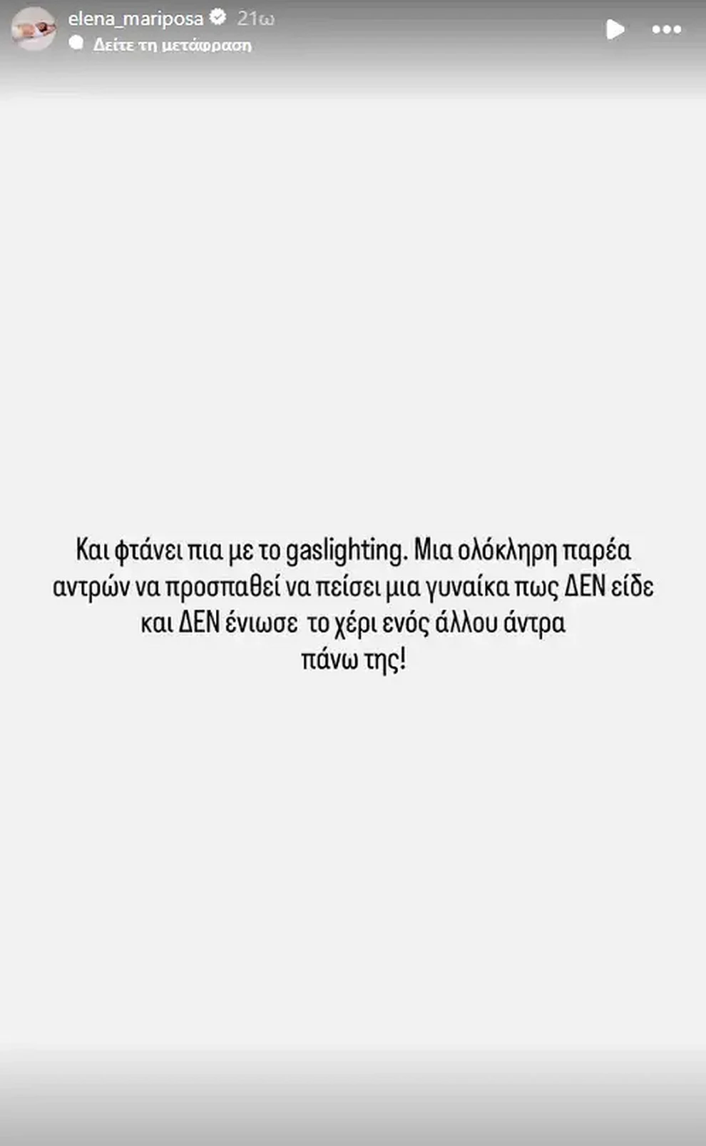 «Και φτάνει πια με το gaslighting. Μια ολόκληρη παρέα αντρών να προσπαθεί να πείσει μια γυναίκα πως δεν είδε και δεν ένιωσε το χέρι ενός άλλου άντρα πάνω της», έγραψε σε μία δεύτερη ανάρτηση η Έλενα Κρεμλίδου.