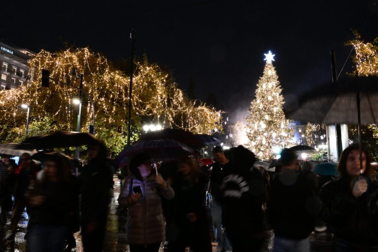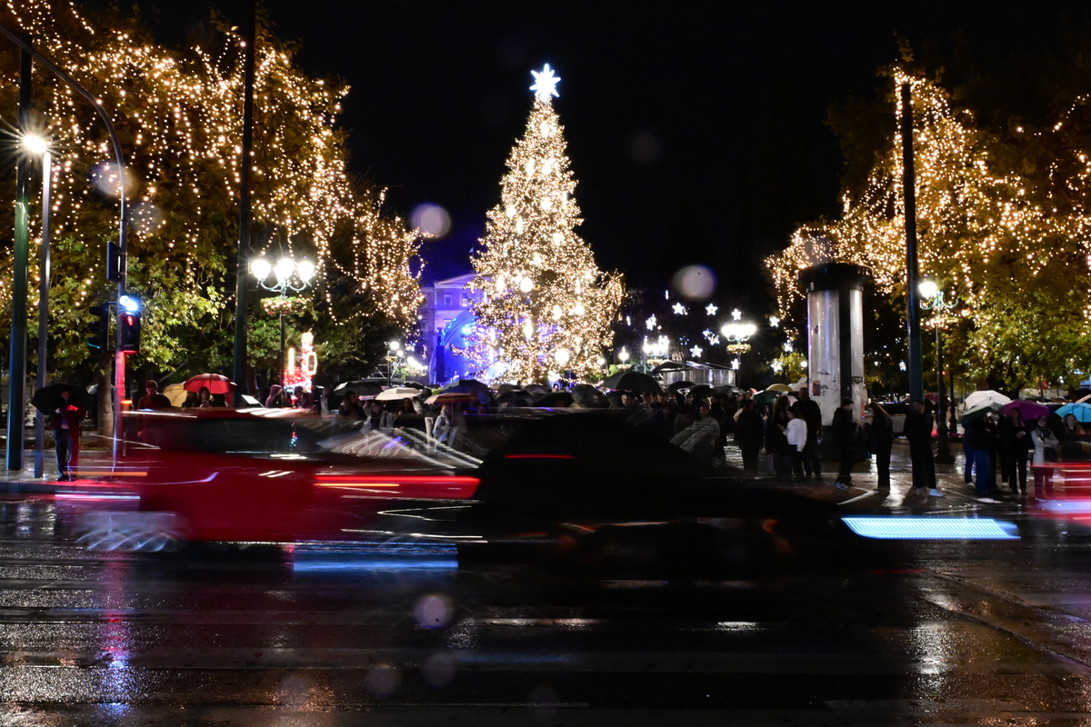 Παρά τη βροχή που «πέφτει» κατά διαστήματα στο κέντρο της Αθήνας, πλήθος κόσμου συγκεντρώθηκε στο Σύνταγμα για να παρακολουθήσει τη φωταγώγηση του χριστουγεννιάτικου δέντρου. Η τελετή πραγματοποιήθηκε σε εορταστικό κλίμα, με τους παρευρισκόμενους να μη χάνουν το χαμόγελο τους, κρατώντας ομπρέλες και βγάζοντας φωτογραφίες μπροστά στο εντυπωσιακά στολισμένο δέντρο. Το δέντρο φωτίστηκε με χιλιάδες λαμπιόνια, ενώ ολόκληρη η πλατεία απέκτησε γιορτινή λάμψη με μουσικές, προβολές και χριστουγεννιάτικες εγκαταστάσεις.