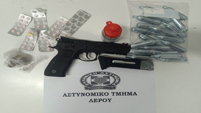 Στην κατοχή του βρέθηκαν και κατασχέθηκαν 4,1 γραμμάρια κάνναβη, 52 ναρκωτικά δισκία χωρίς ιατρική συνταγή, 1.115 μεταλλικά σφαιρίδια και αεροβόλο όπλο.