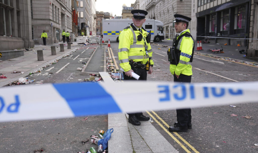 Police officers stand on the street where a 53-year-old British man plowed a minivan into a crowd of Liverpool soccer fans who were celebrating the city's Premier League championship Monday, injuring more than 45 people in Liverpool, England, Tuesday, May 27, 2025.(AP Photo/Jon Super)