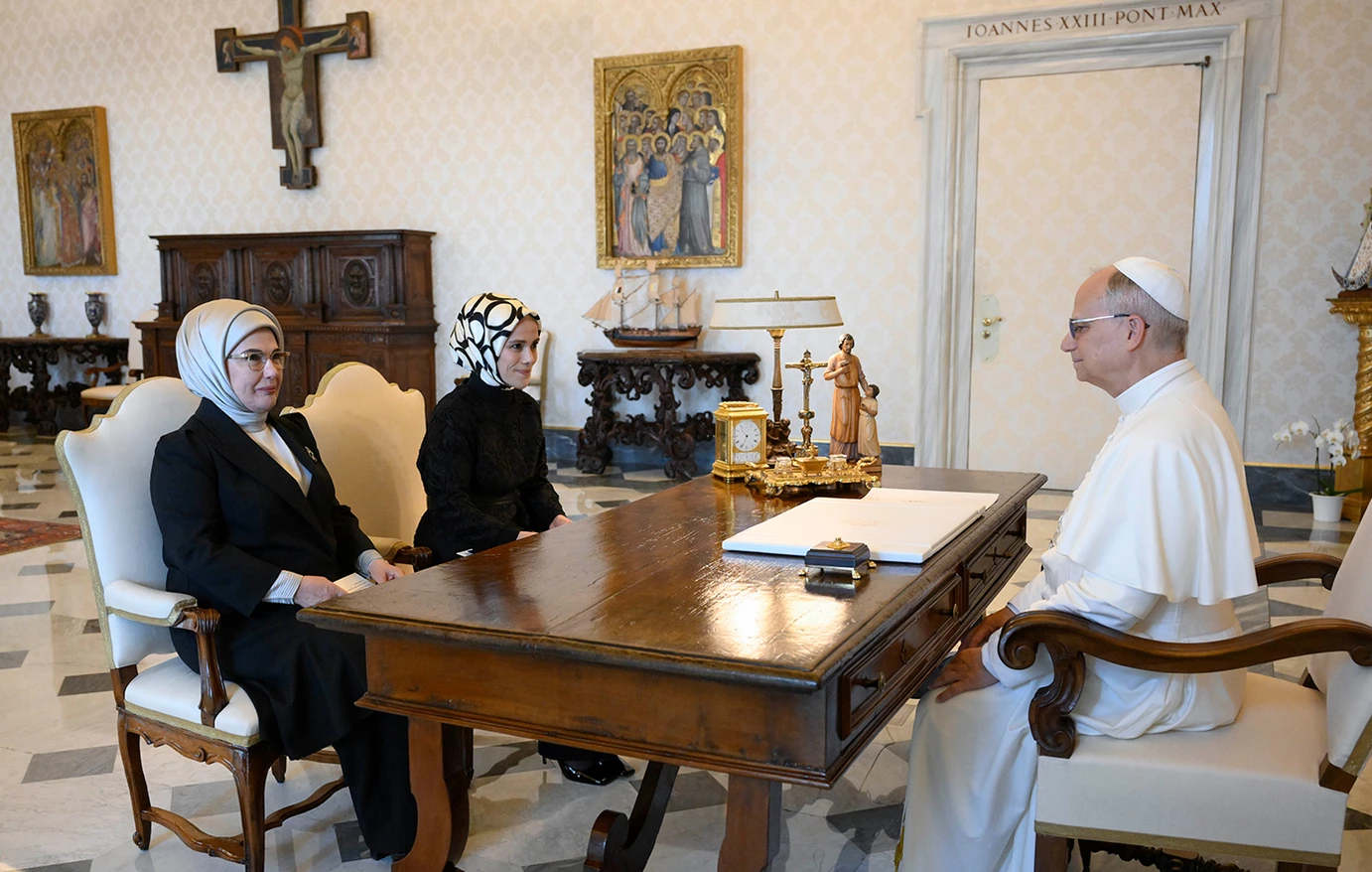 Η σύζυγος του Τούρκου προέδρου, η Εμινέ Ερντογάν, και η κόρη τους Εσρά Ερντογάν Αλμπαϊράκ είχαν συνάντηση εχθές, 2 Ιουλίου, στην Αγία Έδρα με τον Πάπα Λέοντα ΙΔ’.