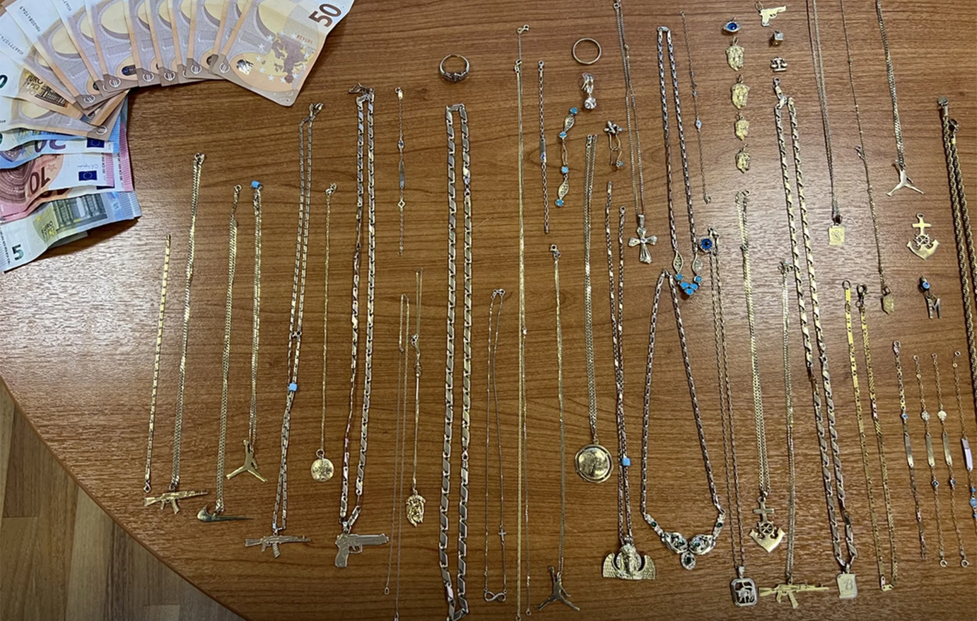 • 57 κοσμήματα χρυσού χρώματος (αλυσίδες και κολιέ με μενταγιόν, δαχτυλίδια, βέρες, σκουλαρίκια (σε ζεύγη), βραχιόλια)