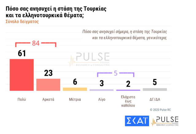 Στην ερώτηση πόσο σας ανησυχεί η στάση της Τουρκίας και τα ελληνοτουρκικά θέματα, το 84% συνολικά απαντά πολύ (61%) ή αρκετά (23%), το 6% των ερωτηθέντων απαντά μέτρια, ενώ το 5% συνολικά απαντά λίγο (3%), ή ελάχιστα έως καθόλου (2%).